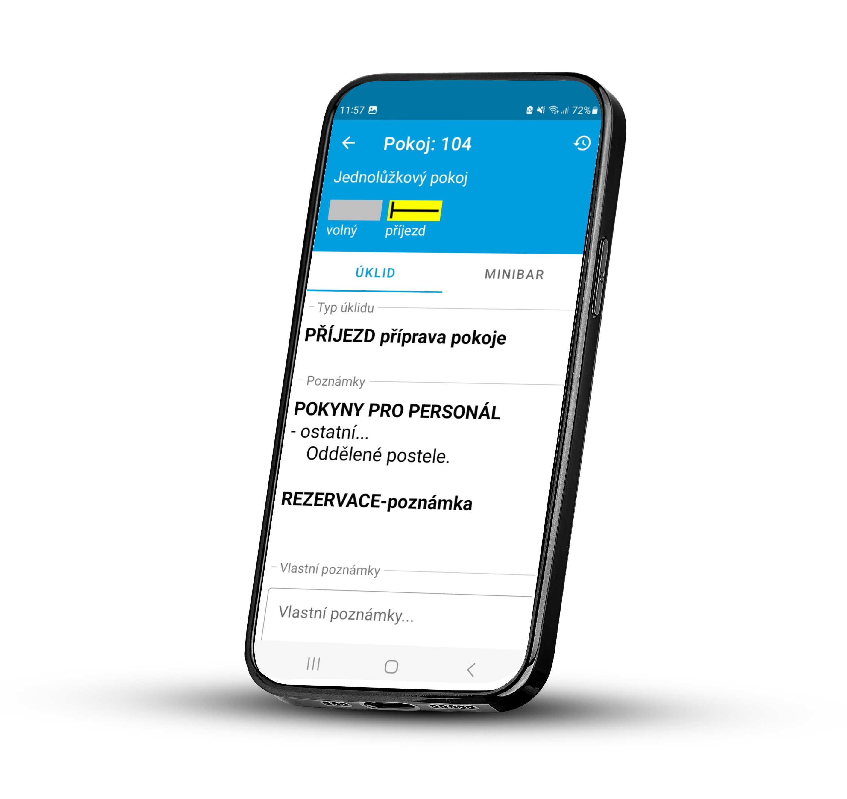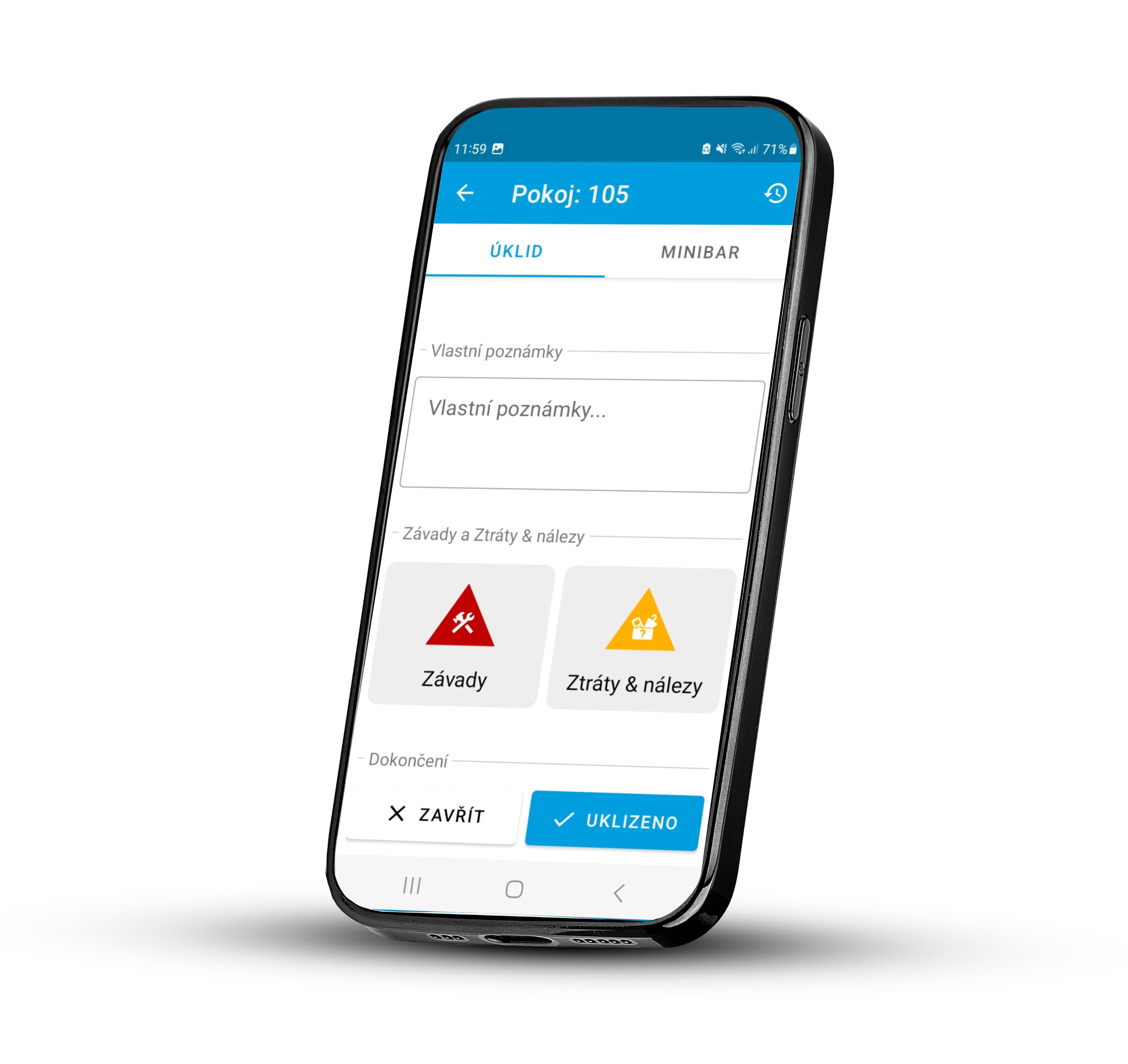 - aplikace je online propojená s modulem Recepce, tedy recepční vidí aktuální stav, které pokoje jsou uklizeny, kde je závada, nález