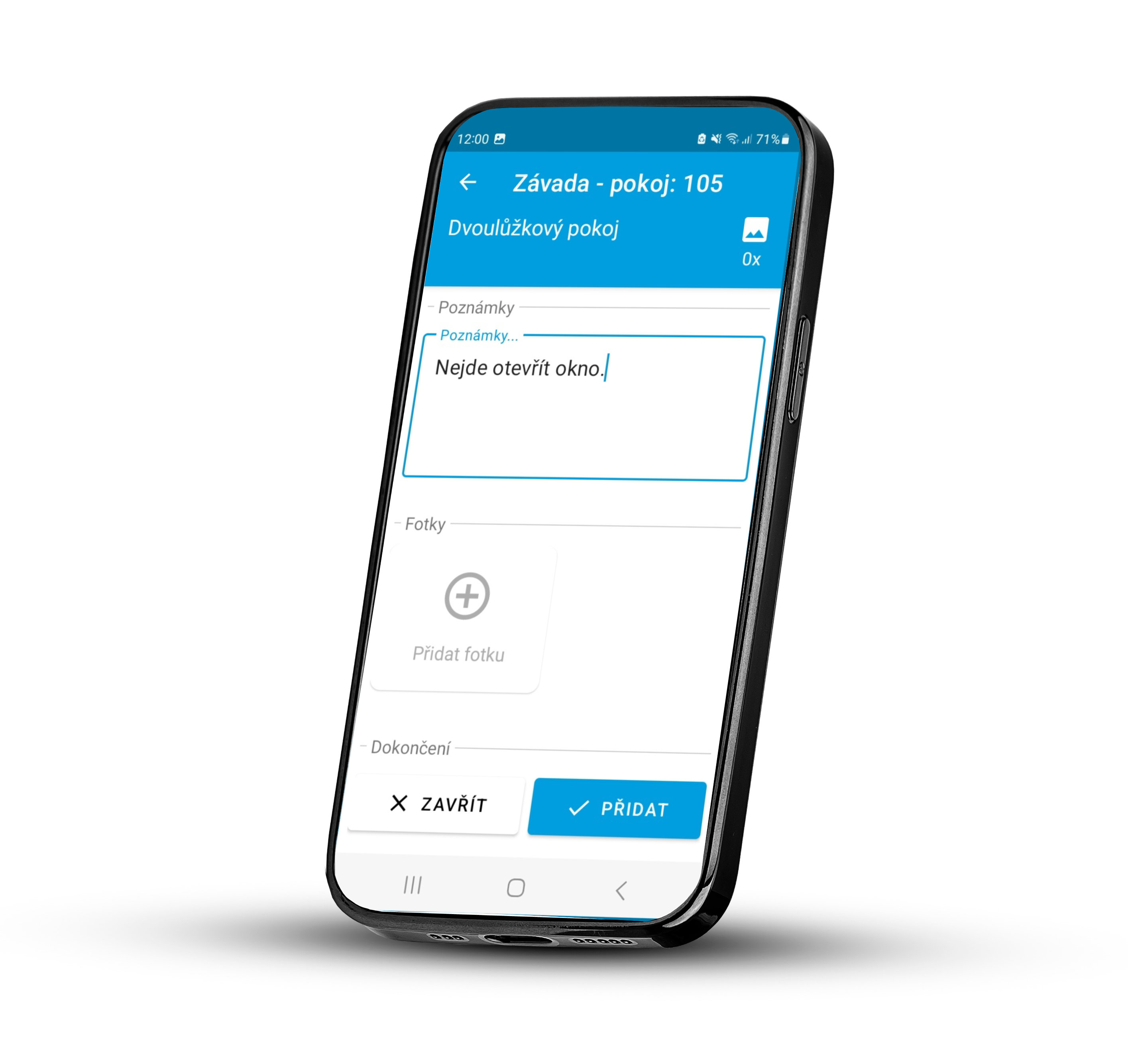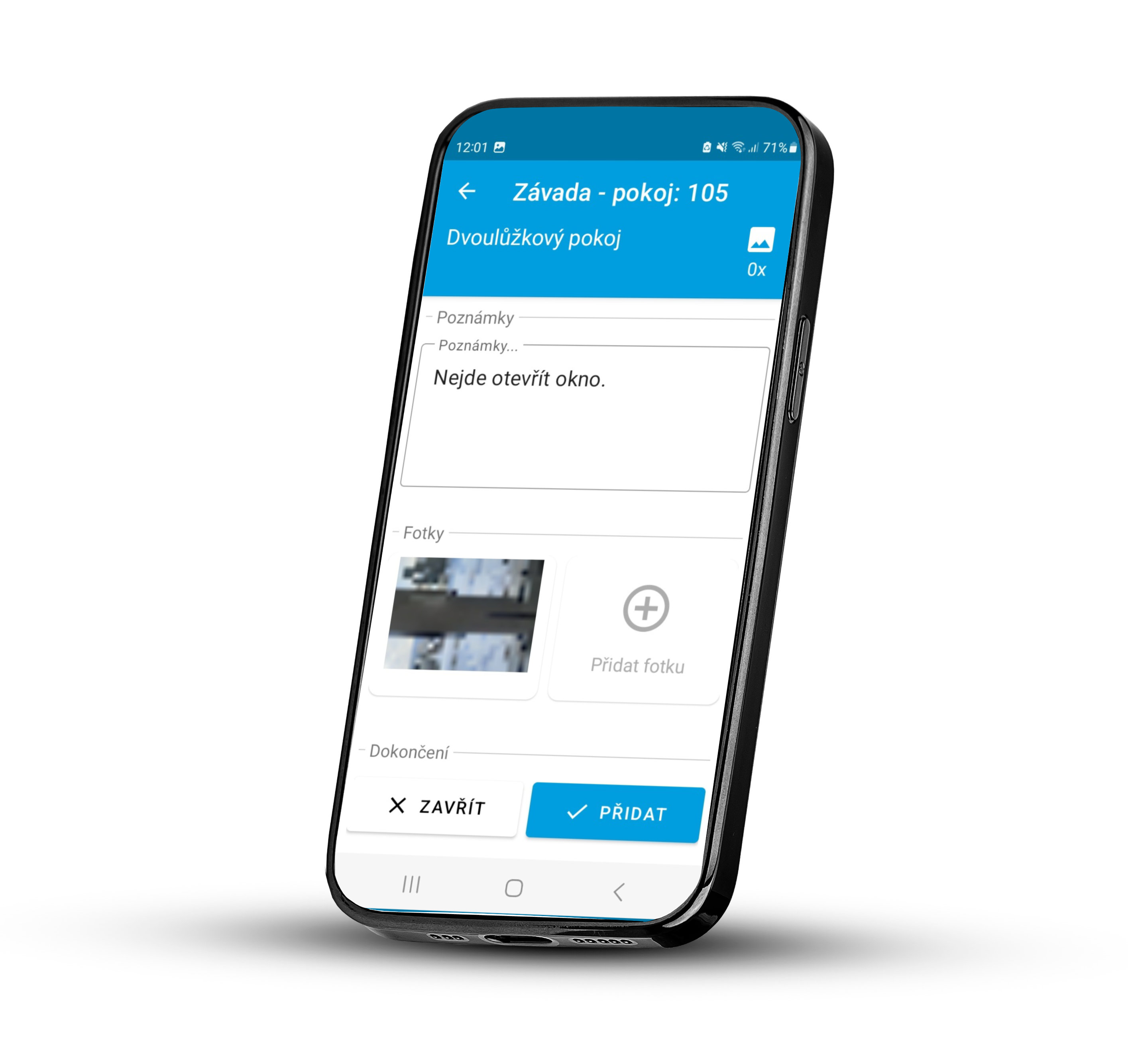 - možnost zadání závady s popisem, fotkou, upozornění v modulu Recepce