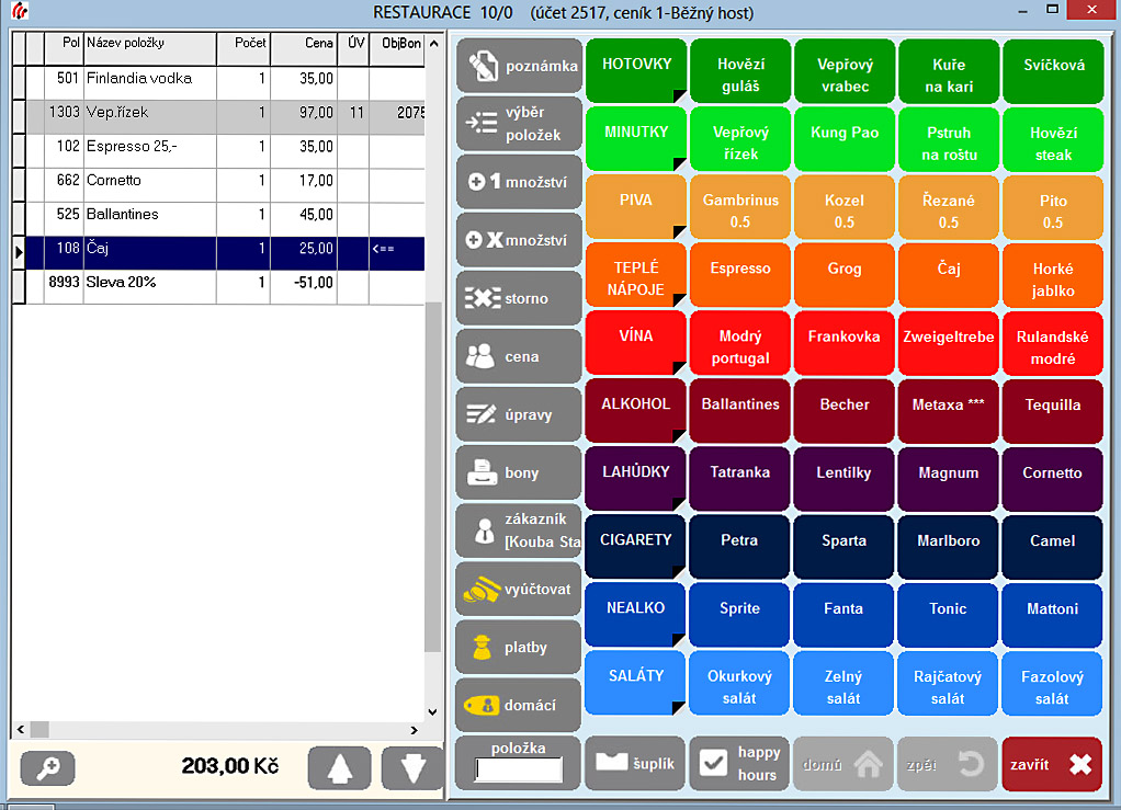 Okno pro práci s účtem hosta obsahuje v levé části položky účtu a v pravé části prodejní položky, které se dají libovolně sestavovat pro konkrétní úsek provozu a které lze opatřit barvou podle vašeho vkusu. Dále je možno tvořit podskupiny položek, např. pod volbou "Teplá jídla" se nabídne skupina všech teplých jídel.