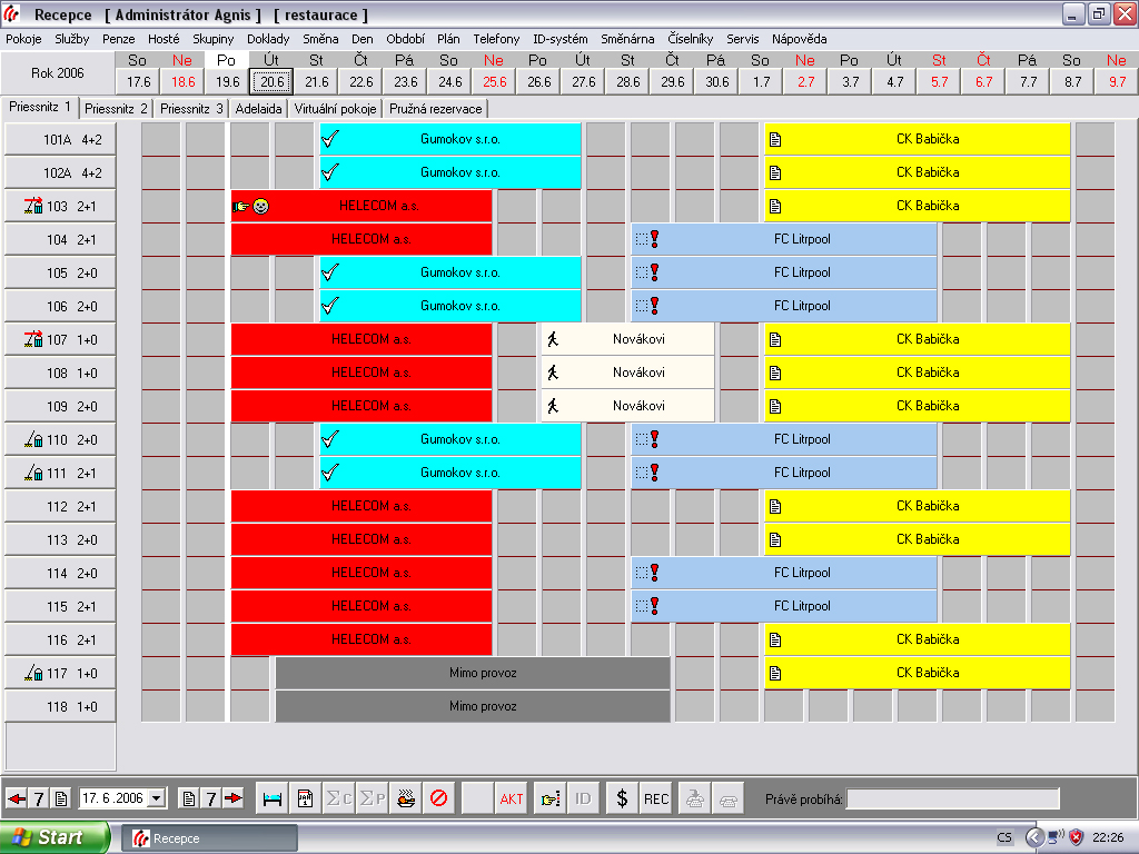 - Rezervace Podrobná evidence rezervací jednotlivců i skupin, kalkulace celkové ceny pobytu, možnost stanovení individuálních cen, určení výše a hlídání termínu úhrady zálohy, názorné sledování požadavků hosta a průběžné zpracovanosti rezervace, rychlé sumární zjištění volné kapacity hotelu s možností uskutečnění sumární rezervace skupiny, potvrzení o rezervaci klasické na papír nebo elektronické zaslané e-mailem, snadný přechod rezervace na ubytování, možnost vystavení zálohové faktury, možnost tisku poštovní poukázky.